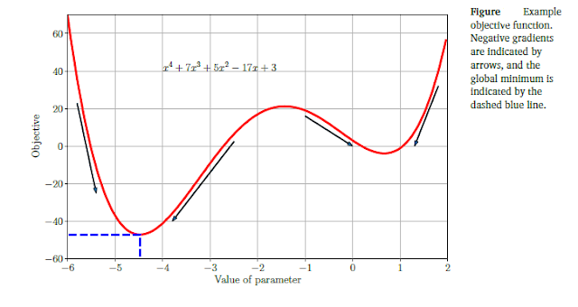 Solving the problem analytically is complicated(According to the Abel–Ruffini theorem, there is in general no algebraic solution for polynomials of degree 5 or more Abel, 1826) and hence we need to start at some value, say $x_0 = -0.6$, and follow the negative gradient. The negative gradient indicates that we should go right, but not how far (this is called the step-size). Furthermore, if we had started at the right side (e.g., $x_0 = 0$) the negative gradient would have led us to the wrong minimum. Figure illustrates the fact that for $x > -1$, the negative gradient points toward the minimum on the right of the figure, which has a larger objective value.